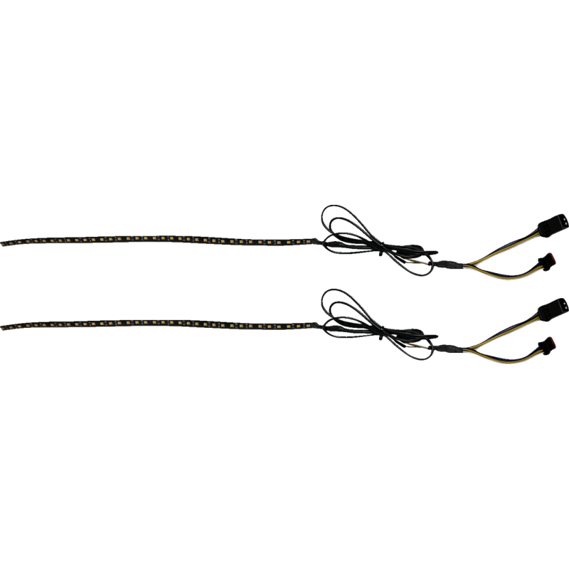 Two low profile LED light strips. Strips are 36” in length and contain 36 dual-color amber/white LEDs. Bright white turning light and full-contrast amber turn signal. Pre-taped for mounting. Can be cut after every 1 1/4” (3 LEDs) to create a custom length. Plug-and-play installation with pass-through male and female JAE connectors. Connectors can be removed for hardwire installation on 12VDC vehicle.