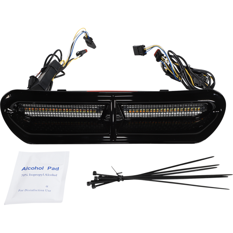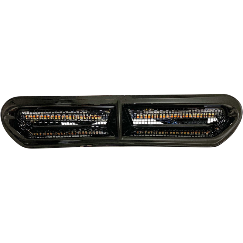 Replaces the factory fairing vent with decorative vent insert. Plug-and-play. Available in gloss black or chrome finishes. 15 super-bright white LEDs operate as constant DRL. 15 amber LEDs function as turn signals.