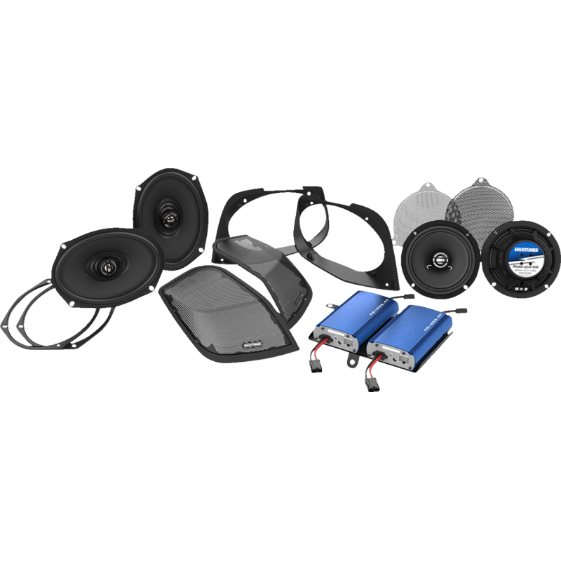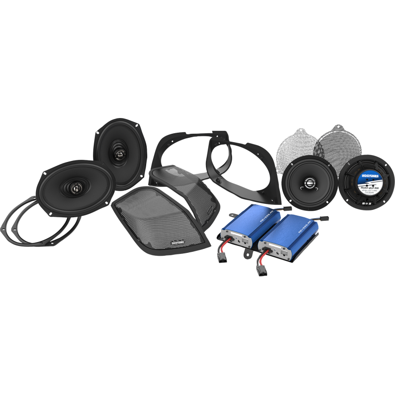 Factory Lid Cut-in kit with two REV 225-RM amplifiers, one pair of Hogtunes 462F-RM Fairing Speakers and one pair Hogtunes 692-XL 6" x 9" lid speakers. Includes single use templates for cutting lids, custom tooled speaker adaptors, Batwing and Road Glide front grilles with chrome and blacked-out badges, custom tooled silicone speaker gaskets, all required wiring and plug-and-play harnesses.