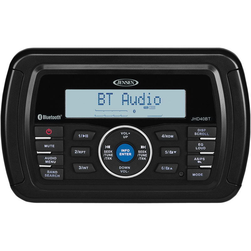 Maximum power output: 160W (4 x 40W). Receives Bluetooth® streaming audio and controls Bluetooth-enabled devices. 7-channel NOAA Weatherband tuner. Waterproof. Multiple mounting capabilities: front flush mount, rear flush mount and surface mount with AMPS pattern.