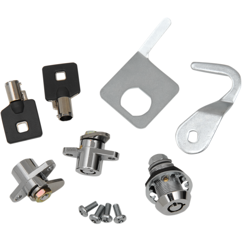 Kit includes two saddlebag lock assemblies and one tour box lid lock assembly. Saddlebag lock assemblies replace OEM #53710-93. Tour box lid lock assembly replaces lock assembly OEM #53848-00 and hook OEM #90686-92. Locks match so one key will open all. Two matching keys included.