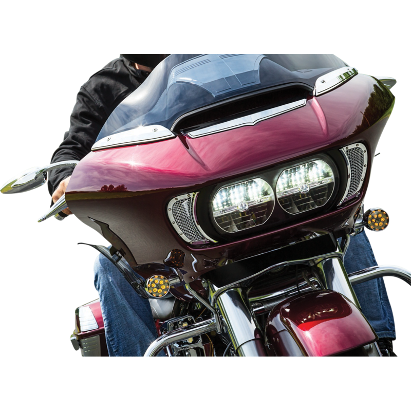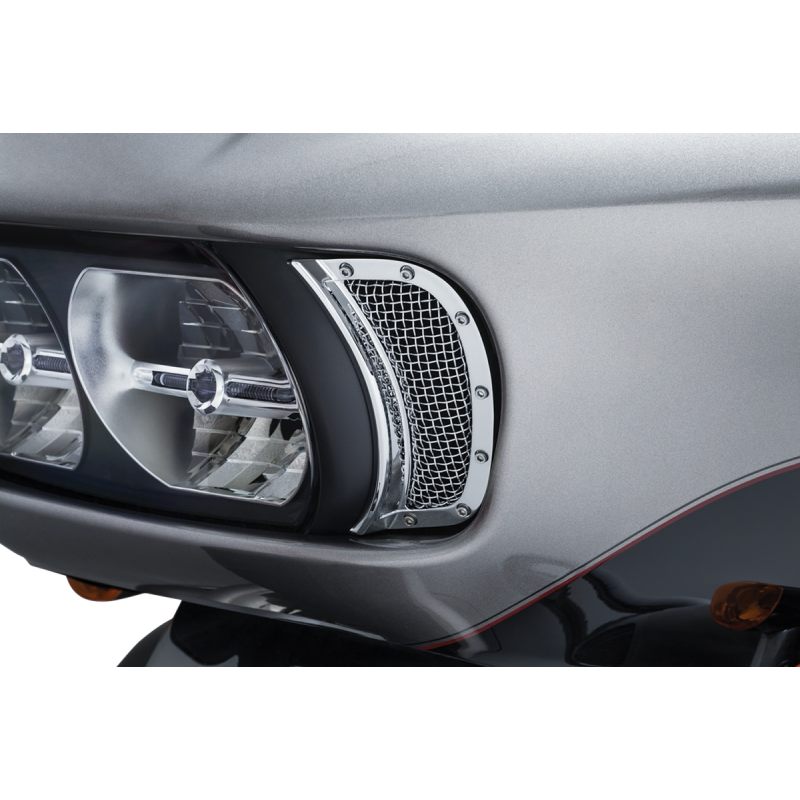 Rugged and industrial grilled design delivering an aggressive styling enhancement for the headlight vent. Aluminum outer frame with formed steel mesh panel.