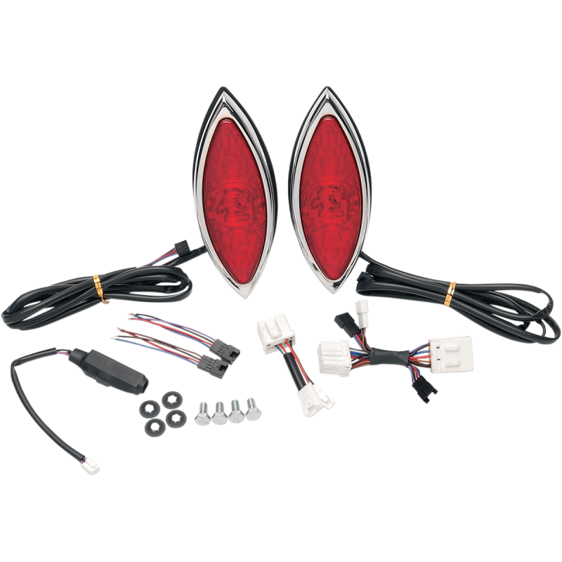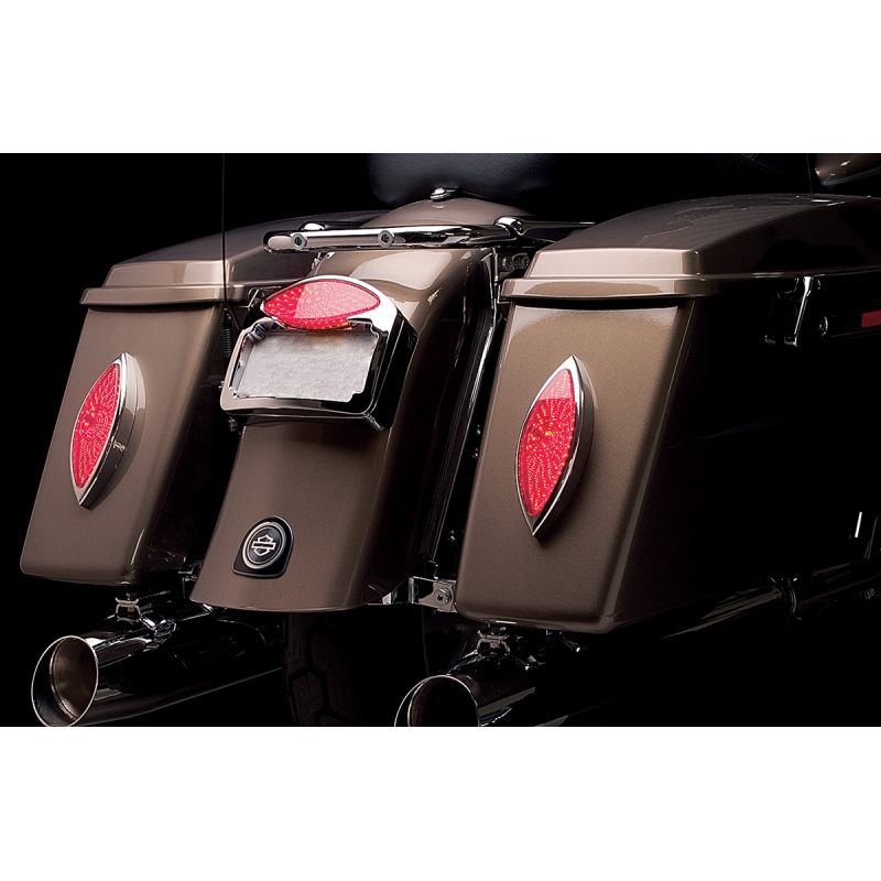 Mount to flat surfaces and come with gaskets. LED design; have brake, running and turn signal capabilities. Feature chrome bezel; measure 6 3/4" L x 2 5/8" H x 1" D. Use OEM plugs/connectors or can be spliced into existing wiring harness. Sold in pairs.