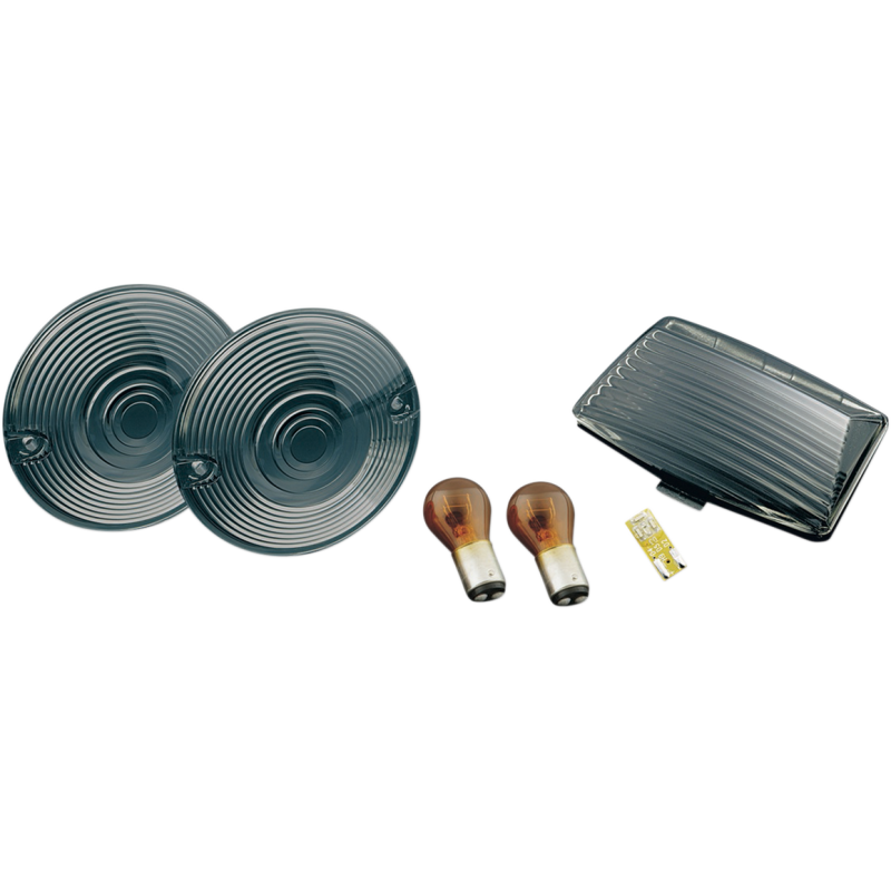 Smoke lens kit adds style. Turn signal bulbs are red or amber incandescent and fender tip bulbs are red or amber LED. Kit includes fender tip lens with LED bulb and a pair of FL-style smoke turn signal lenses with colored incandescent bulbs.