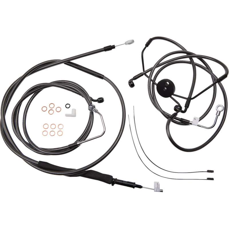 Complete handlebar kits including Magnum Viking handlebars, braided cables, and DOT brake lines. Features patented internal design for easy wiring installation (E-Z pull-thru sleeving). Available in Black Chrome/Black Pearl finish.