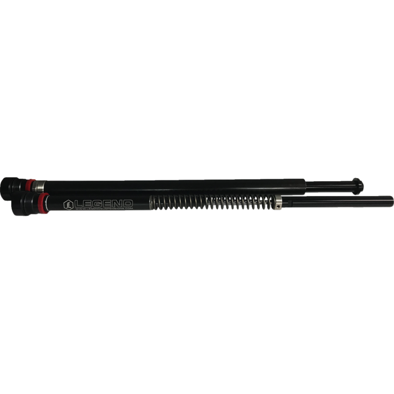 High-performance front suspension system for Softail models with 43 mm inverted forks. Replaces asymmetrical stock fork internals with a high-performance twin cartridge set. Includes two mono-tube, dual-chambered damper cartridges. Internal linear spring guide and polyurethane bump stop.