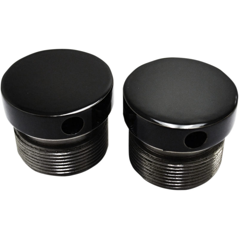 CNC machined from billet aluminum. Easy installation using a single Allen wrench or a screwdriver. Replaces the stock hex-shaped fork caps that come stock and rest above the triple tree. Gloss black powdercoated finish. Made in the U.S.A.