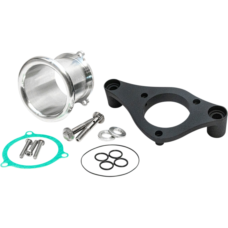High flow design billet aluminum construction. 4" opening with internal taper down to 62 mm ID. Fits M-Eight throttle body three hole bolt pattern. Impressive horsepower and torque gains on engines running modified and ported cylinder heads and intakes with larger throttle bodies. Great performance part for racing and for those that want to head to the track on the weekend. Includes the aluminum backing plate and needed hardware for standard head breathers. Made in the U.S.A.
