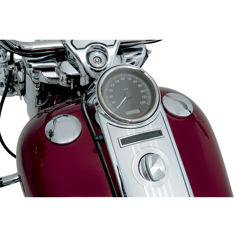 Chromed low-profile gas caps feature screw-in paint protectors and ratchet-action cap. Available in vented, non-vented, and dummy styles. Dummy cap replaces OEM fuel gauge.