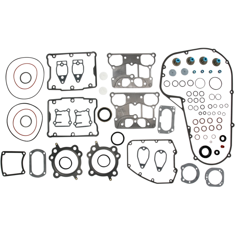 Extreme Sealing Technology (EST) complete gasket kits. Features Multi-Layer Steel (MLS) head gaskets, Steel Viton-coated base gaskets, Blue Viton valve stem seals, and Aluminum Foam Material (AFM) race-style exhaust gaskets. Complete kits include motor gasket kit plus primary, derby, and inspection cover gaskets. Made in the U.S.A.