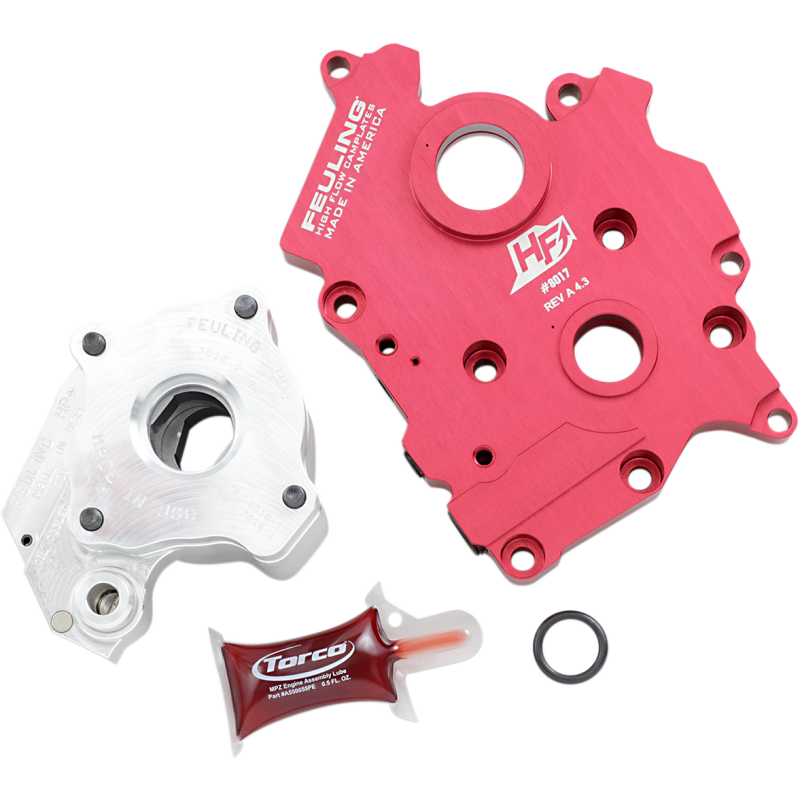 Increase oil pressure, oil volume, engine oil flow and return oil scavenging. Quieter and smoother engine operation. Reduces wet sumping, blowby and oily air cleaners. Includes a billet 6061 aluminum high volume oil pump and Feuling High Flow billet camplate made from 7075 aluminum. Made in the U.S.A.