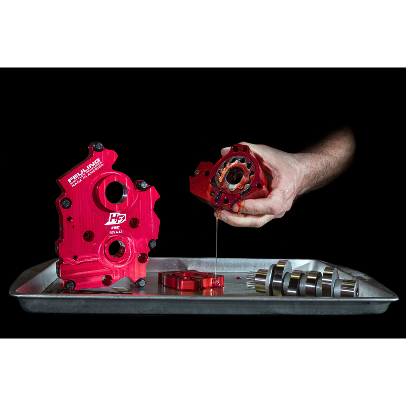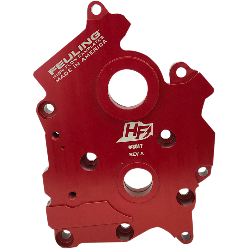 Increases engine oil flow and volume by enlarging the oil pump reservoirs and critical oil passages. Matches oil portholes to engine case holes. Lowers engine temperatures by 15-25 degrees and oil temps by 15-25 degrees when matched with Feuling HP+ or Race Series oil pumps. Made from 7075 billet aluminum, 50% harder and stronger than factory cast. Eliminates flexing and need for bronze bushings. Increases rear wheel power gains when matched with Feuling Race Series Oil Pump. Made in the U.S.A.