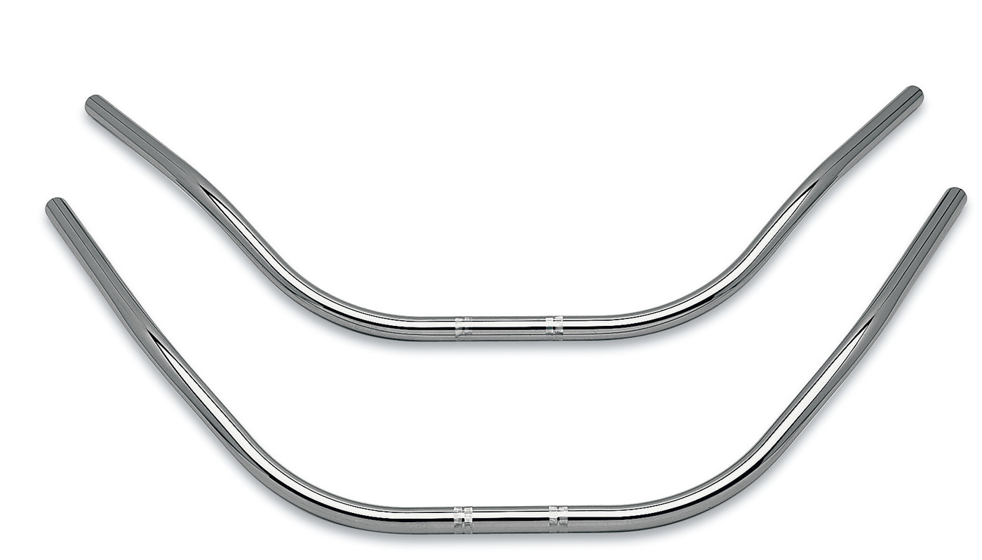 Dimpled and drilled, chrome. End Rise: 7", Width: 34 1/2", Center Width: 9", Pullback: 13 1/2"