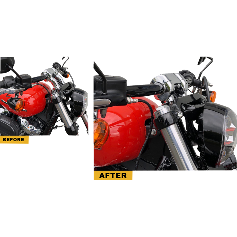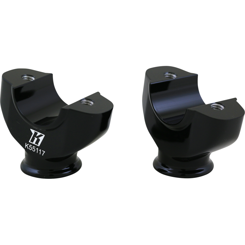 Stylish lower risers constructed of forged aluminum. Works with stock upper clamp and speedometer housing. Approximately 1 1/4" from bottom of riser to handlebar.