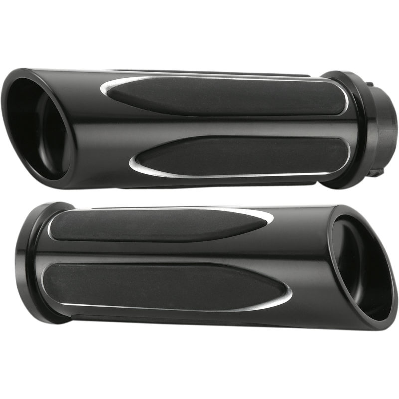 Billet grip bodies machined to perfection with innovative rubber inserts. Grips have a slightly larger diameter than stock, which helps with hand fatigue during long rides. Matching floorboards and foot/shift pegs available.