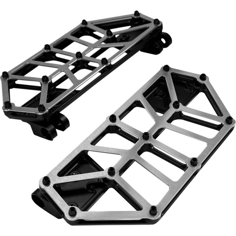 Made from CNC-machined billet aluminum. Anodized black lower with brushed stainless steel cover. Extremely light with enhanced foot traction (0.8 lb. each). Aluminum base with stainless covers are easy to customize. 10" long, 4.5" wide, 0.6" thick. Sold in pairs.