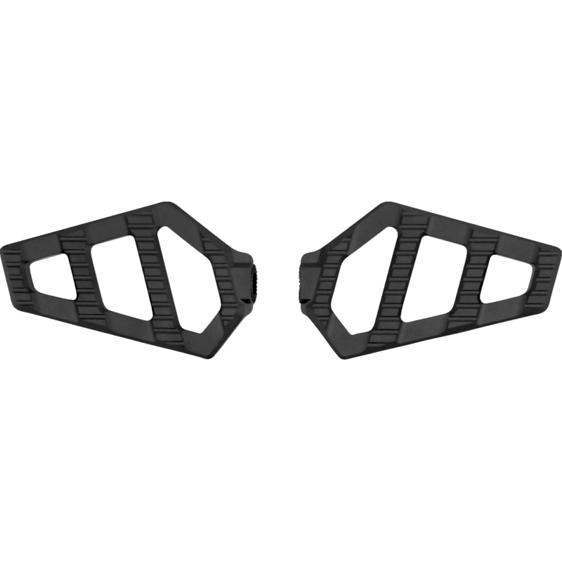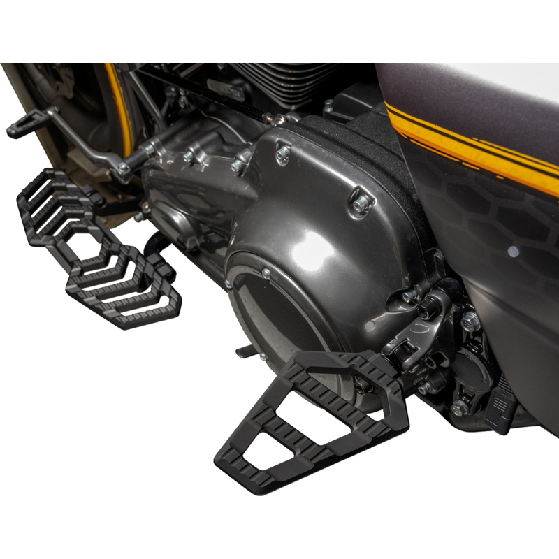 CNC-machined billet aluminum mini floorboards, black anodized. 4" long, 6.5" wide, 0.75" thick. Can be used as driver or passenger boards with purchase of model specific splined adapters.