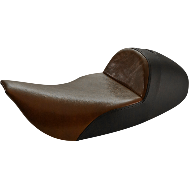 Genuine distressed brown leather construction with cowhide tanned to produce unique covers. Low, wide, and contoured for better control and riding comfort.