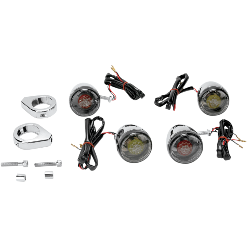 Custom front and rear LED turn signals. Chrome signal housings and smooth smoke lenses. Dual-function bulb-style LED. Front (amber) signals include chrome 41 mm mounting clamps and chrome mounting stems. Rear (red) signals include hollow mounting stems. Sold as a complete kit. DOT compliant.