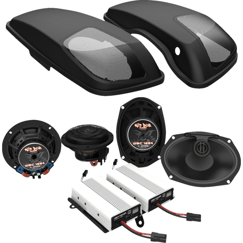 Complete kits with fairing speakers, saddlebag lids with 6" x 9" speakers and 2 amps for 800-watts of total power. Features R.E.M.I.T. circuitry for excellent FM reception from a Class D amp. Dual WBA 400.2r amplifiers easily install inside inner fairing. Pre-tuned to factory radio; makes installation very simple. Safe for bike’s charging system. All required hardware and wire is included. Supplied plug-and-play wire harness allows radio’s fader to work.