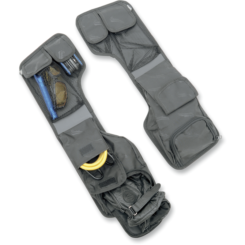 Trim, functional and smartly styled organizers that fit snugly into the lids of H-D-style hard saddlebags. Organize trip packing and maximize cargo space with closed and mesh see-through storage pockets. Elastic bands keep flashlight, tire gauge and other gear in place. Includes right and left organizer. Easily install with hook-and-loop fastener strips. Rugged 600D and 150D polyester construction. Dimensions: 20" L x 6 5/8" W x 1/2" H. Sold in pairs.