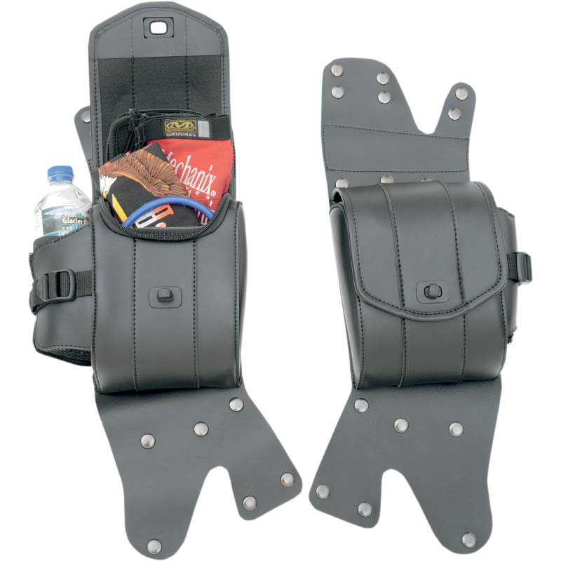 Rugged storage bags bring style and convenience to any H-D bagger with FLHT-style saddlebag guards. Leather-grained UV- and weather-resistant 3 mm-thick SaddleHyde bags have spacious inner compartments and fold-away mesh beverage holders. Includes right and left organizer. Rigid construction bags hold their shape even when empty; quarter-turn flap releases accept mini-padlocks. Dimensions: 7 1/2" L x 4 1/2" W x 15" H. Sold in pairs.