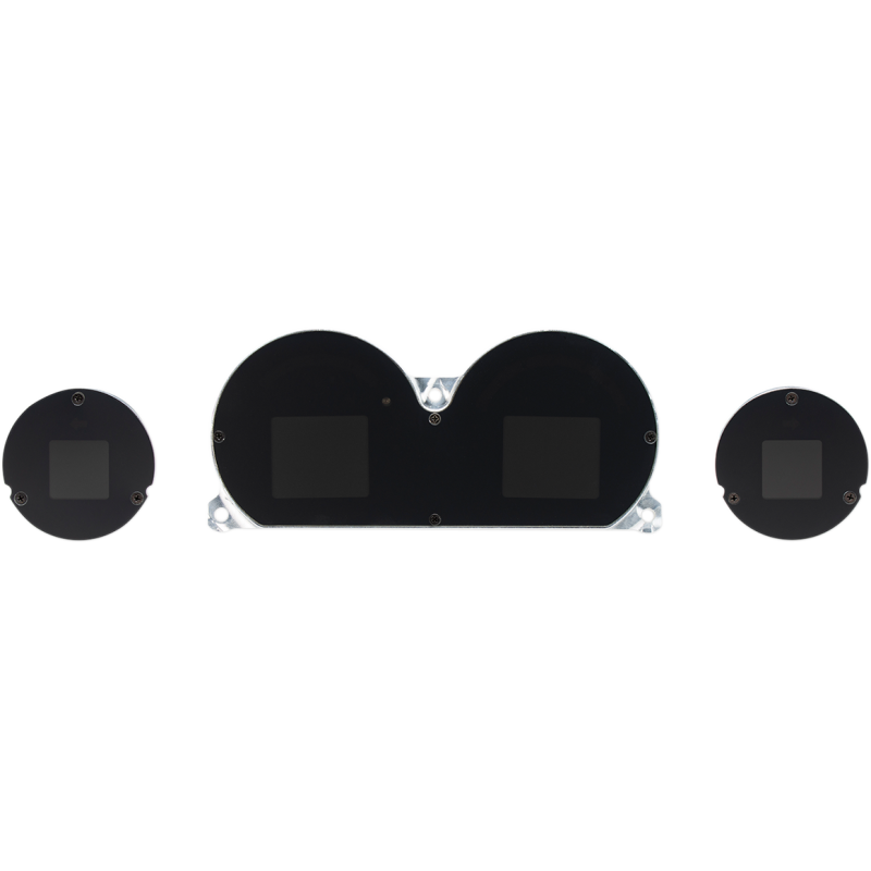 Direct plug-in four-gauge digital instrumentation system. High-visibility LED display is easy to read, even in direct sunlight. Includes 3-3/8" speedometer with odometer, dual trip meters and tachometer. Also includes a pair of 2-1/16" fully programmable gauges that can display oil pressure, oil temperature (sensor included), voltage and fuel level readings.