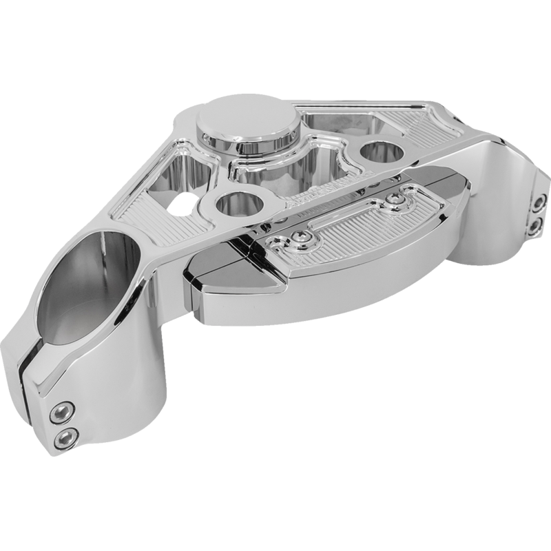 CNC machined from billet aluminum featuring a drop design with a chrome finish. Drop tree design adds extra height to the front end (+2") while keeping proper geometry. Method tree allows you to add aftermarket risers or T-bar handlebars to Road Glide models. Innovative ignition switch cover design.