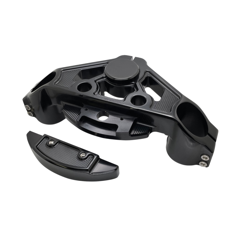 CNC machined billet aluminum triple tree kits featuring a drop design that adds extra height (+2") to the front end while maintaining proper geometry. Allows adding aftermarket risers or T-bars to Road Glide models.