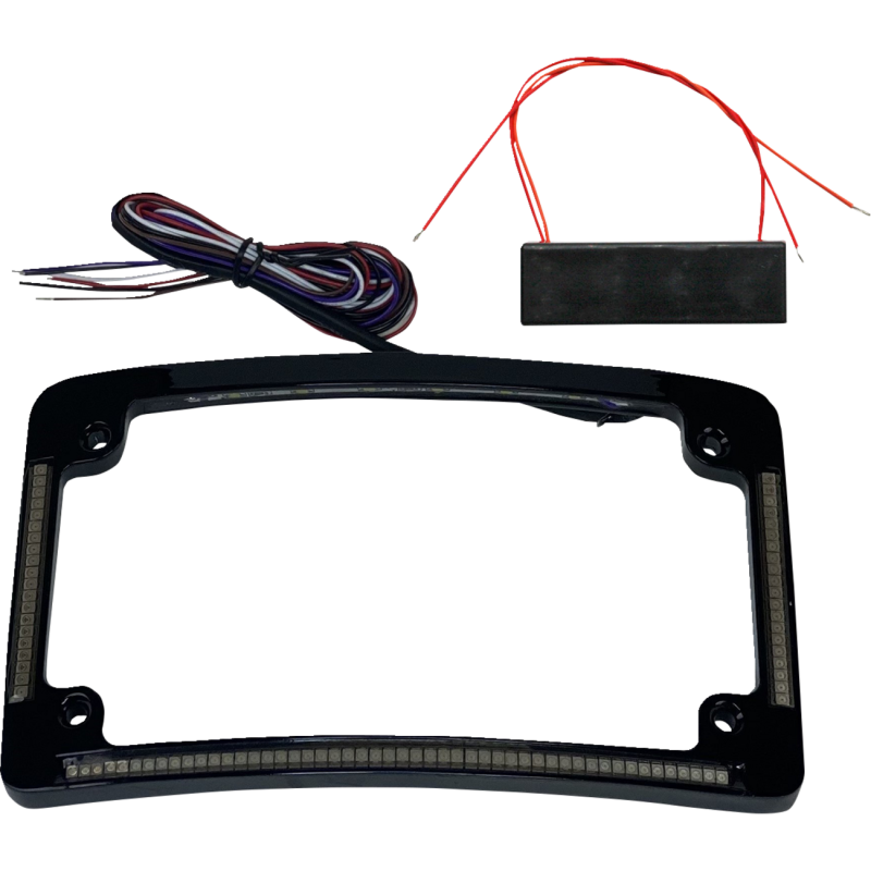 Radius license plate frame featuring three banks of auxiliary red LEDs and tag illumination. 20 red LEDs are flush mounted on either side with a row of 50 dual-intensity red LEDs flush mounted across the bottom. Six white LEDs embedded for tag illumination. All wires exit a single location.