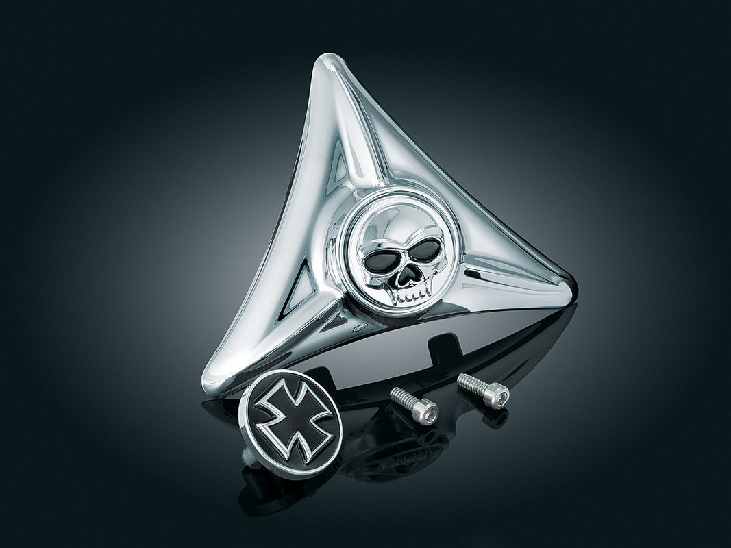 Covers the exposed holes in the fender when the stock license plate bracket is removed. Completely covers the “footprint” left by the stock mount. Interchangeable Maltese cross and skull emblem inserts. Sold each.