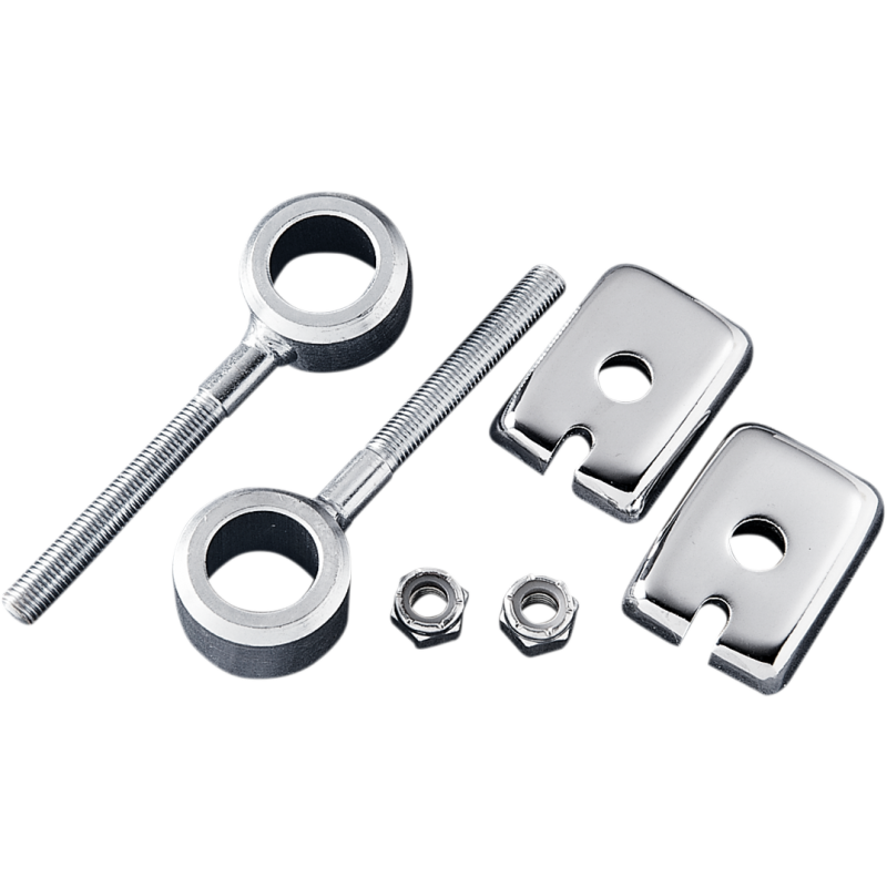 Chromed axle chain adjusters. End cap and locknut included. Sold in pairs.