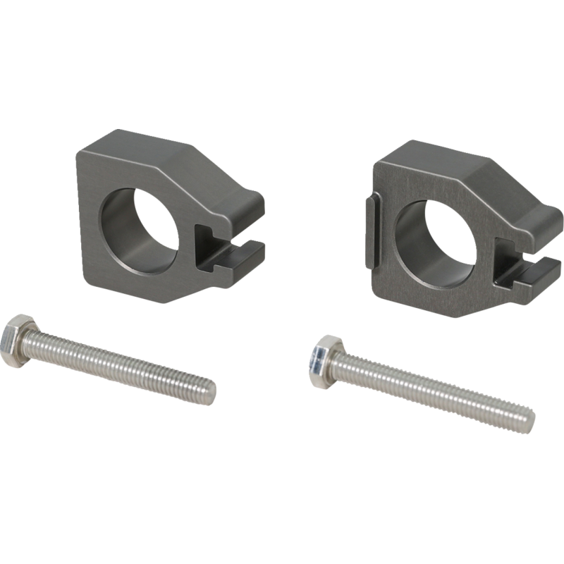 Replaces the stock chain adjusters. Made of 6061-T6 aluminum. Captures the nut on the left-hand side. Hard anodized in stealth gray finish.