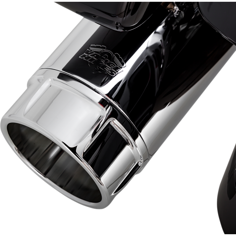 Cutting-edge design enhancing M-Eight or Twin Cam engines with a rich, bold roar. Features massive 4 1/2" diameter muffler bodies with CNC-machined billet end caps. Designed to work with stock headers or Power Duals.