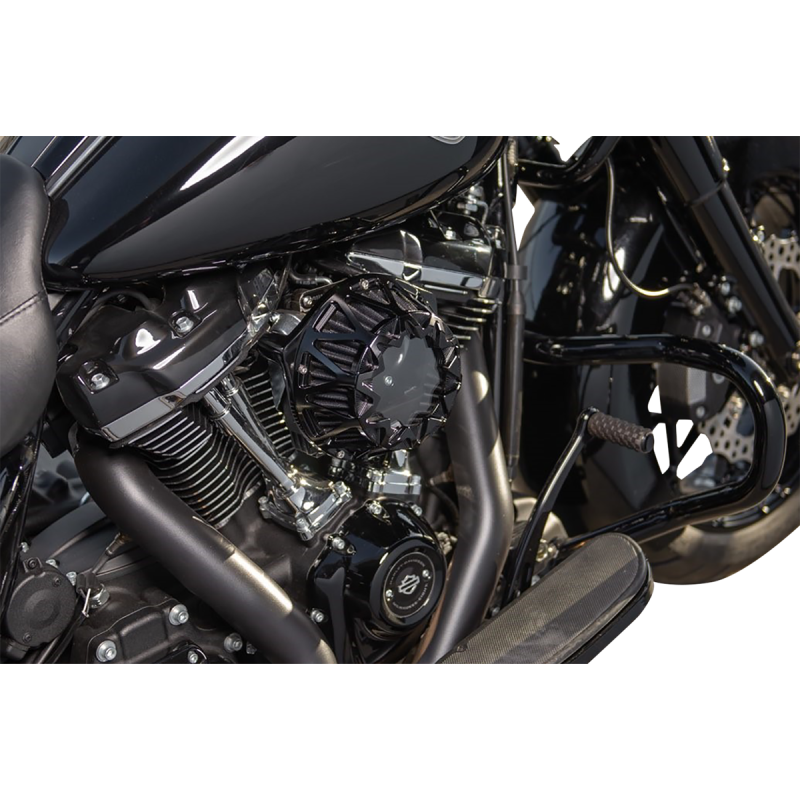 Design inspired by the all-new H-D Prodigy™ wheels found on 20-24 Special Touring models. Reduced intake height for improved leg clearance. Forged billet aluminum air cleaner featuring a polycarbonate window to view the internal working of air intake system. Hidden breather backing plate technology; breather design is O-ringed at the heads, passes through the backing plate and exits inside the mouth of the throttle body through proprietary shooter tubes. M-Eight applications feature an integrated oil-catch to ensure no oil reaches the air filter and restricts airflow.