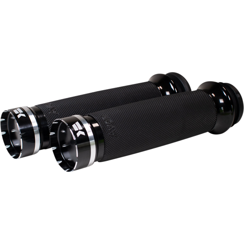 Seamless Rubber Grip technology with billet aluminum end caps and collars. Match for Khrome Werks Turbine, Tracer, Edge and Klassic muffler end caps. Contrast Cut features a polished surface that is black anodized then re-cut. Fit bars made for 1" grips. Made in the U.S.A.