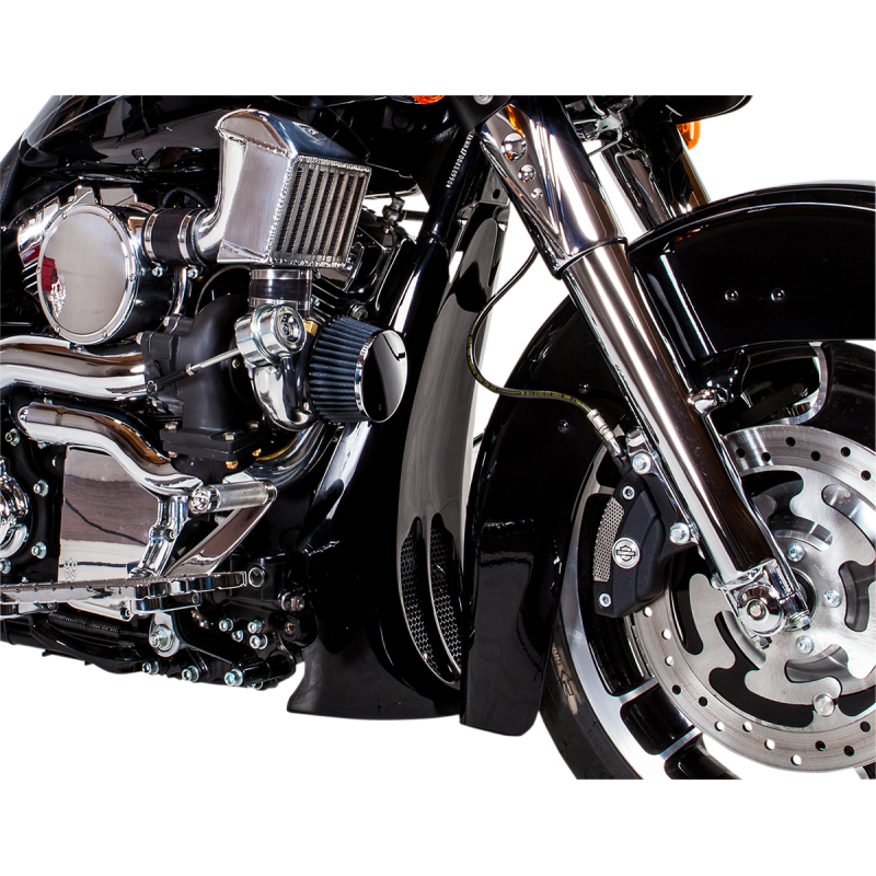 Hand-laid fiberglass construction with a gel-coat finish. Helps fill the gap between the wheel and the front of the frame to add a custom finishing touch to a Bagger. Includes all necessary hardware and grille insert.