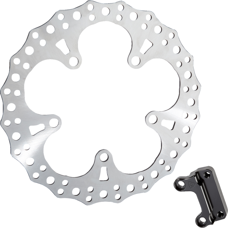 Drastically improve braking performance as well upgrade the style of the factory front wheel. Each rotor is constructed from 420 high-carbon stainless steel then drilled for optimum performance and heat dispersion. Billet brake caliper adapters are included in each kit to properly relocate the factory caliper. Utilizes factory brake caliper, rotor hardware and brake hose. Easy bolt-on installation; no need to re-bleed the brake system. Each kit includes a 13" rotor, caliper adapter bracket and all necessary hardware. Must order right and left side separately.