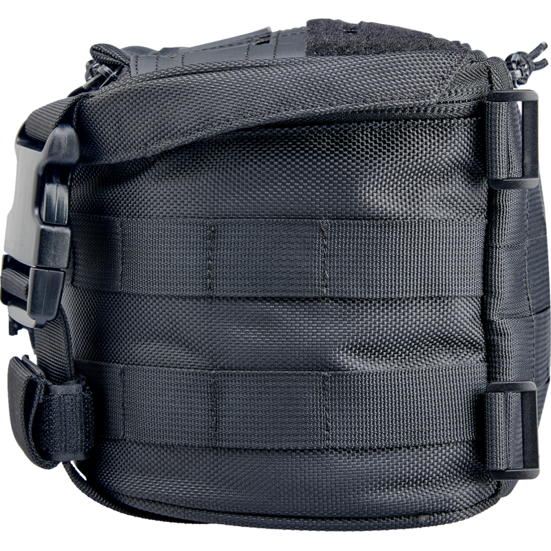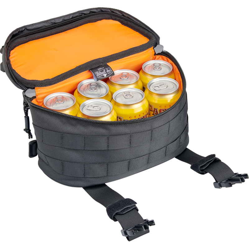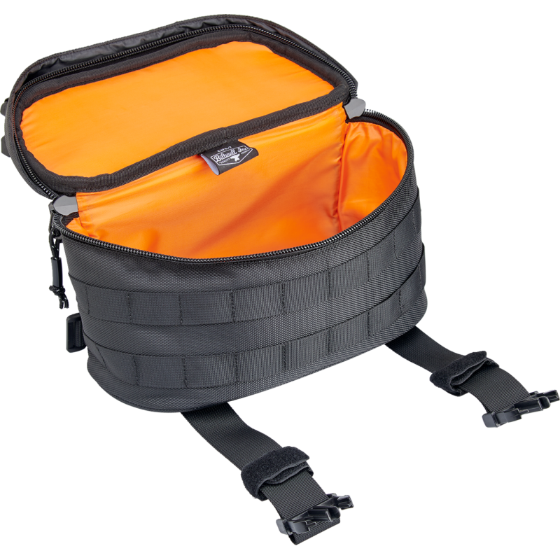 A versatile bag with a MOLLE system for various configurations. One main and three secondary pockets offer plenty of room. Fully customizable for different applications and mounting locations. Features rugged, rust-free nylon zippers, UV-treated 1680D polyester nylon construction, and Duraflex quick-release buckles. External chassis panels are PVC backed for water resistance. Hi-viz orange nylon interior makes spotting contents easier. Interior volume holds seven 12 oz. cans. Dimensions are Main: 11" W x 5.75" H x 4.75" D; large pocket: 9.75" W x 5.75" D with 8" opening; small pocket: 5.75" W x 4.25" D with 4.5" opening.