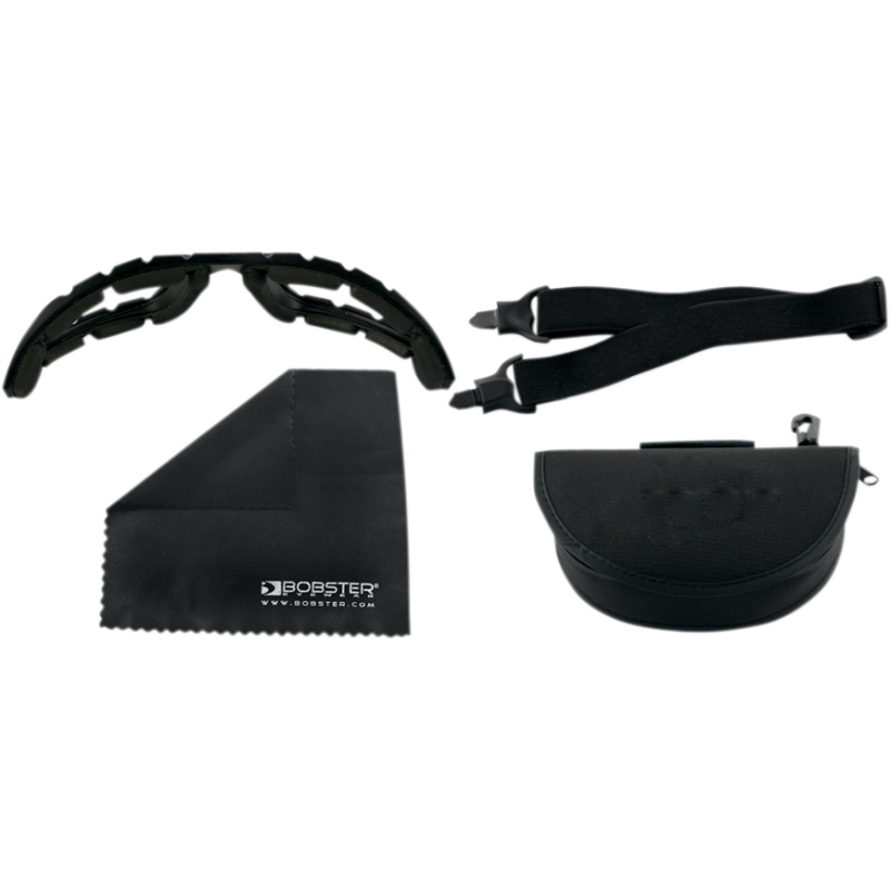 Uniquely styled convertible sunglasses/goggles with photochromic lenses that start clear and darken to smoke in bright sunlight, featuring a VLT rate of 88% to 45%. The polycarbonate frame has removable, closed-cell foam. Includes a goggle strap, carrying case, and microfiber cleaning cloth. Provides 100% UV protection. ANSI Z80.3 approved and certified to EN 166.