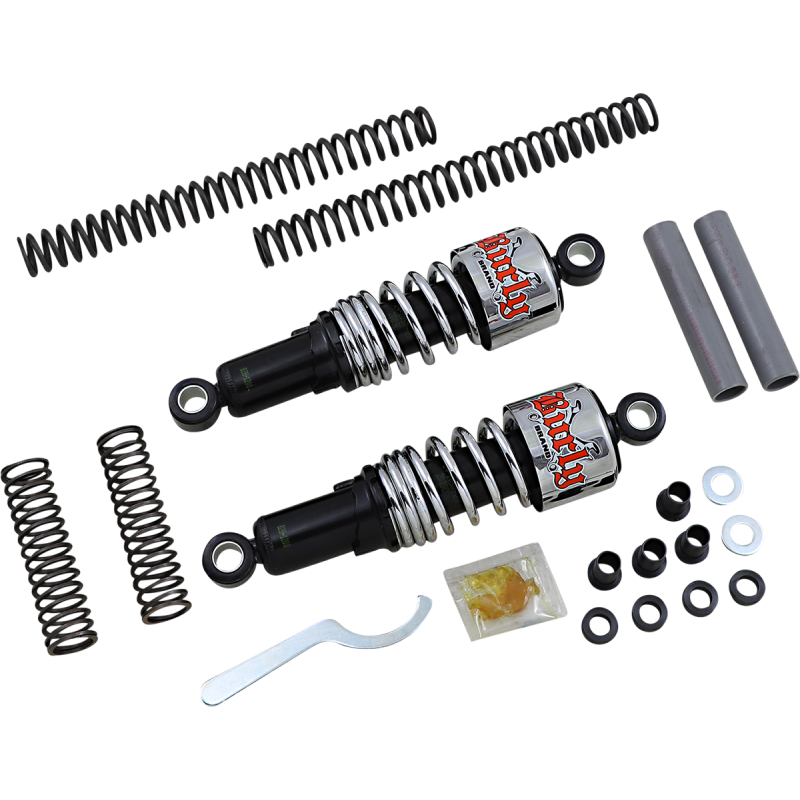 Complete lowering kit includes 10.5” shocks with chrome or black springs and covers (unless noted) and fork springs. Drop-in fork springs lower front end up to 2”; shocks lower rear up to 2 1/2”.