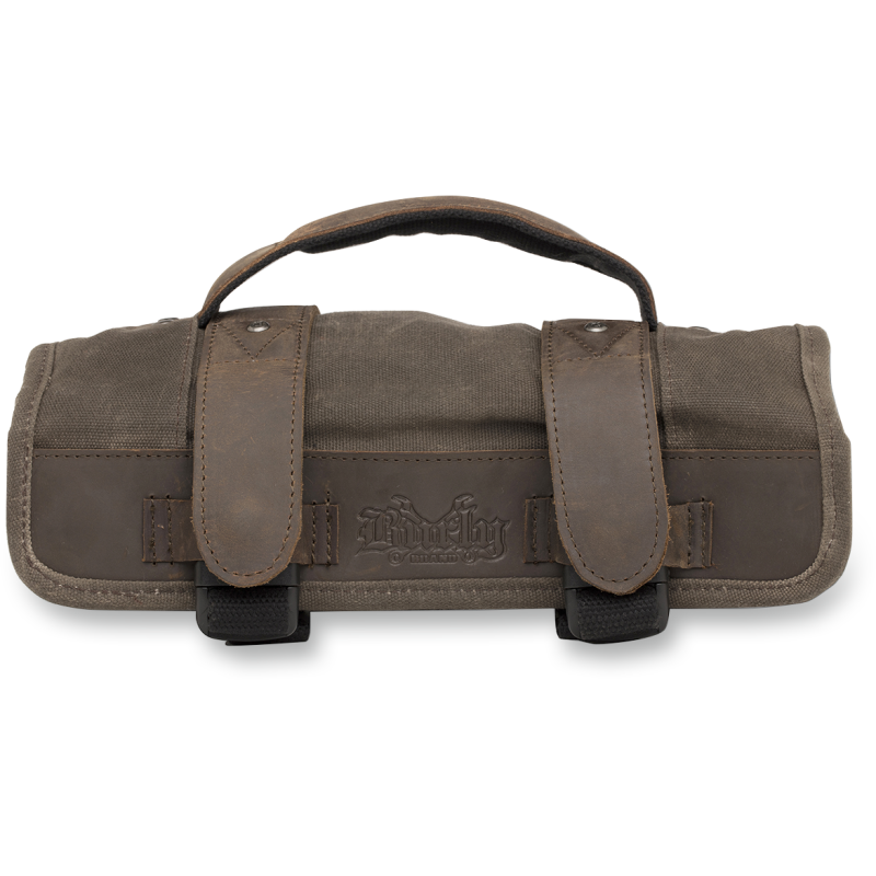 Constructed from wet-waxed UV-treated cotton canvas with leather securing straps and carry handle. Features an eight-pocket system in three widths, a catchall zippered pocket, speed buckles, and an anti-flap snap closure system. The adjustable quick-release mounting system works on handlebars, sissy bars, or side frames.