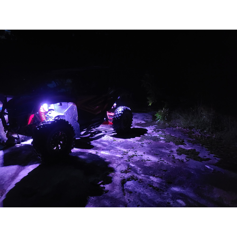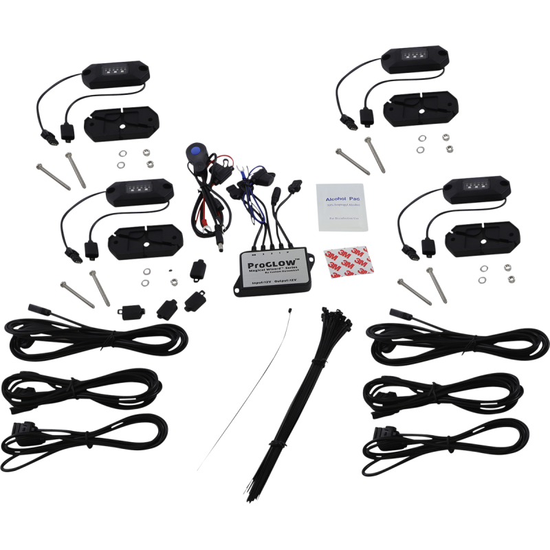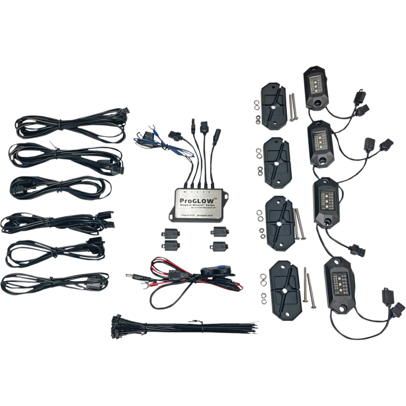 A system of color-changing LED rock lights for all 12VDC systems, controllable via a Bluetooth ProGLOW controller. The system is expandable and includes various mounting and wiring accessories.