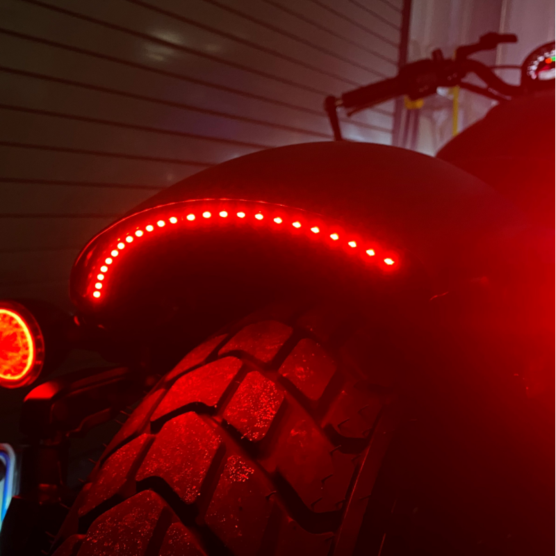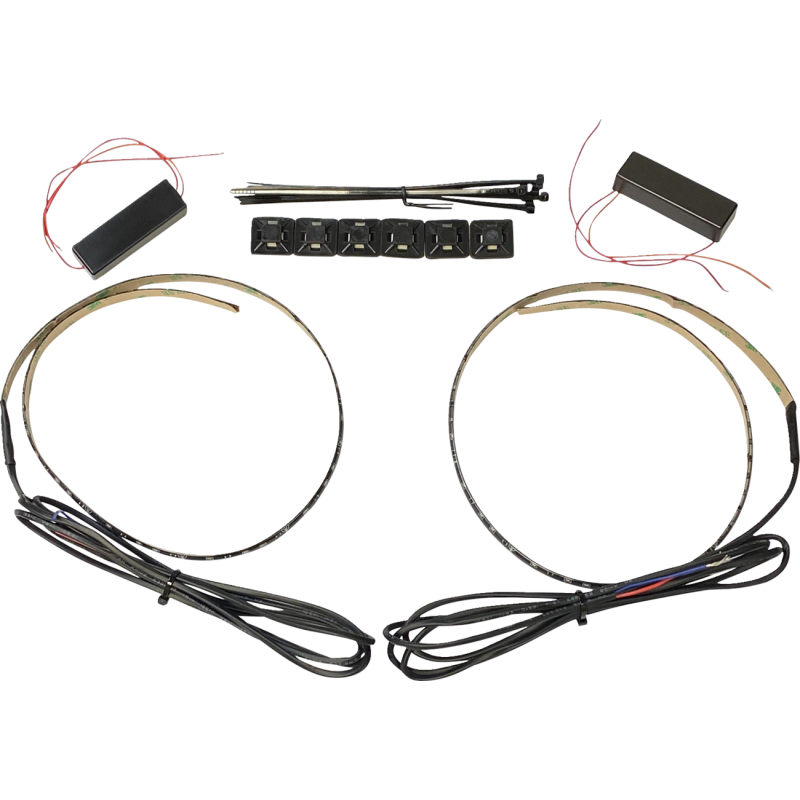 Flexible, low-profile auxiliary LED strips designed to mount under the rear fender edge. Each 23.5" long strip contains 72 dual-intensity red LEDs placed at a 90° angle to shine towards the rear. Strips have 5' wire leads and can be cut every 6 LEDs (1.95") to customize length. Universal design with 3-wire installation. Sold in pairs and pre-taped for mounting.