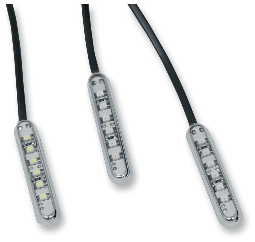 A compact, bright spot of light with six high-power single-function LEDs. Ideal for adding an extra brake light (red), extra turn signal (amber), or for license plate illumination (white). Simple two-wire connection. Measures 2.3" L x 0.45" W x 0.2" H. Sold each.