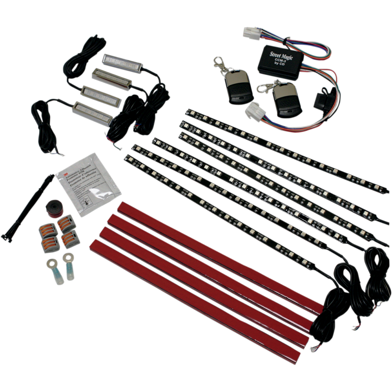 Designed to light up the engine area. Available with Magical Wizards™ ProGLOW™ Bluetooth® controller. Includes two 15-LED Magical Wizard flexible strips, two flexible mounting sticks, and four color-changing standard Magical Wizard pods.