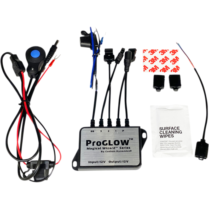 Controls Magical Wizards™ LED accent light system. Connects to the ProGLOW™ app through a personal iOS or Android device to customize and control color changing lights. Includes a push button main power switch, three independently controlled zones (front/mid/rear), and can sync with audio. Features solid color, color-changing modes, and color match technology.