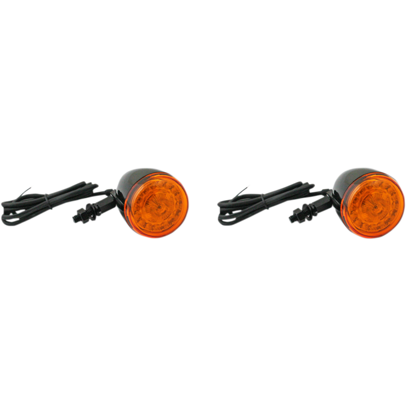 Features 24 amber dual-intensity turn, automotive-grade LEDs per unit. Housed in an aluminum bullet housing measuring 3.125" L x 2.25" D with a 5/16" - 18 mounting stud. Available in chrome or gloss black finish with amber lenses. DOT & SAE compliant. Sold in pairs. NOTE: Load equalizer may be required.