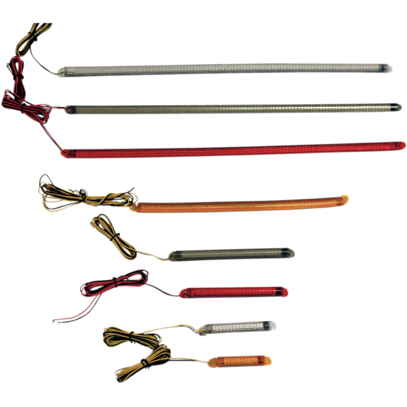 Dual density flexible LED strips designed for use as running, turn, or brake lights. Features a unique faceted design for increased viewing angle. Pre-taped with automotive-grade tape and sealed with military-grade RTV. Strips have 36" copper wire and are 0.34" W x 0.30" H. Sold each.