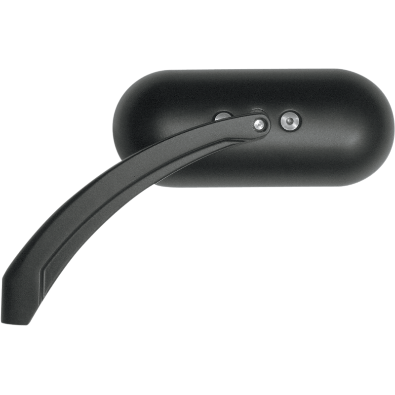 Fits most handlebars and looks great. Machined from billet aluminum. Designed by master bike builder Don Hotop. Fits right or left side. Mirror width 4 13/16"; mirror height 2"; stem height 4"; stem offset 3 1/2"; 10 mm right-hand threads. Sold each. Made in the U.S.A. NOTE: Requires mirror adapter DS-302148 (Honda/Kawasaki/Suzuki applications) or DS-302149 (Yamaha applications), see page 450.